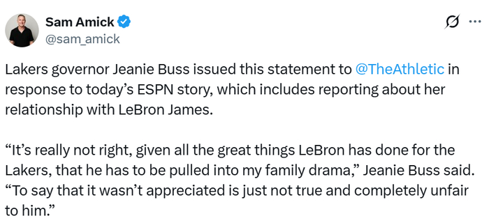 珍妮-巴斯就今日ESPN的相关报道,向The Athletic媒体发布声明,该报道中包含了关于她与詹姆斯关系的相关内容。珍妮表示:“勒布朗为湖人立下了汗马功劳,如今却被卷入我们的家族纷争,这实在太不应该了。说球队不感激他的付出,这绝非事实,对他而言也极度不公。”