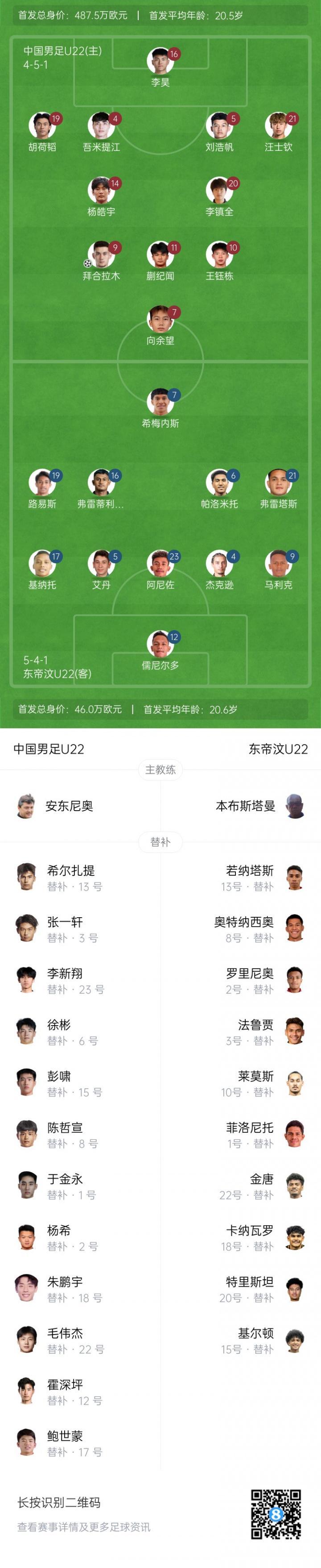 第42分钟,中国队前场右路任意球,皮球前点被对手蹭了一下,后点拜合拉木破门!U22国足1-0领先东帝汶↓
